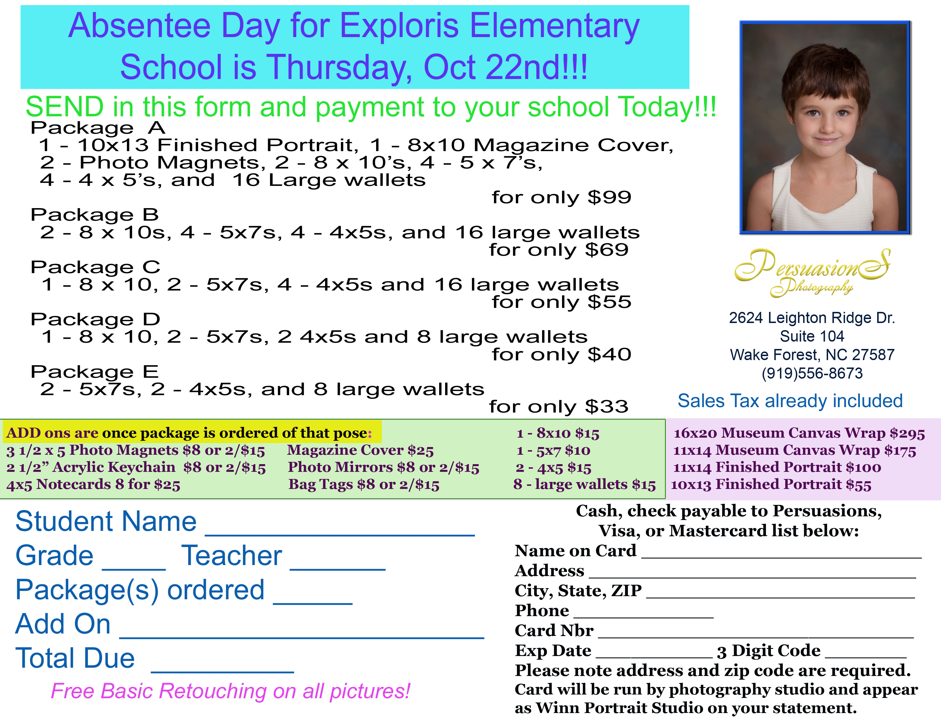 October 17, 2015October 16, 2015 brookesomers Make-up Photos – Thursday, October 22nd If you would like to retake your child’s photo, return the photo package that you received along with the completed form below. Photo retakes for both schools are Thursday, October 22nd. Elementary School Form Middle School Form Share this: Click to share on X (Opens in new window) X Click to share on Facebook (Opens in new window) Facebook Like Loading... Related