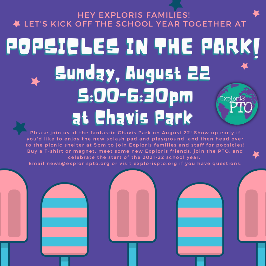 Let’s show our support for the entire Exploris Staff! - Popsicles in the Park- Sunday, August 22, 5:00-6:30pm at Chavis Park. Scroll down for more info. We hope all Exploris families will be able to join us outdoors on Sunday.