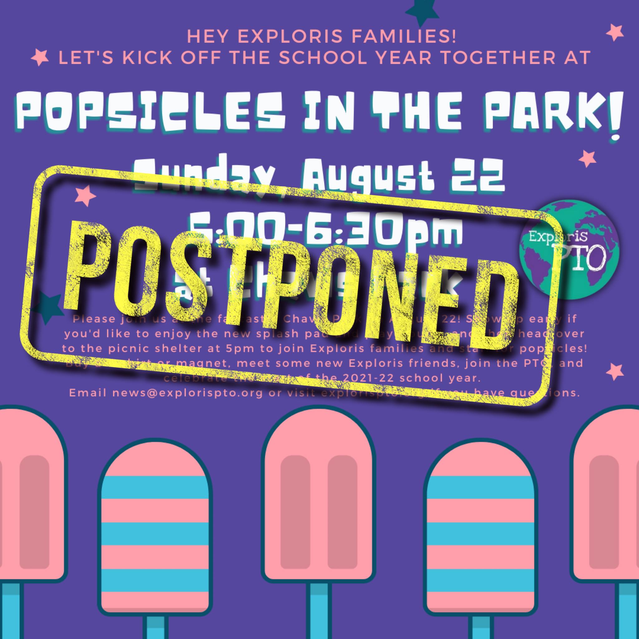 Popsicles in the Park has been postponed until next Sunday due to inclement weather.It is rescheduled for Sunday, August 29, 5:00-6:30pm at the #ExplorisSchool elementary campus.