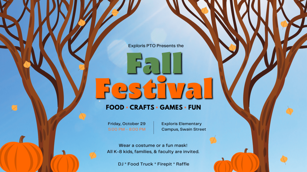 This Friday evening from 5-8pm, you are all invited to join us for the Exploris Fall Festival! This fun event is being sponsored by the Exploris PTO and will include two food trucks, a giant inflatable slide, a pumpkin carving contest, lots of fun games, a DJ and dance area, a firepit, cornhole tournament, and more!