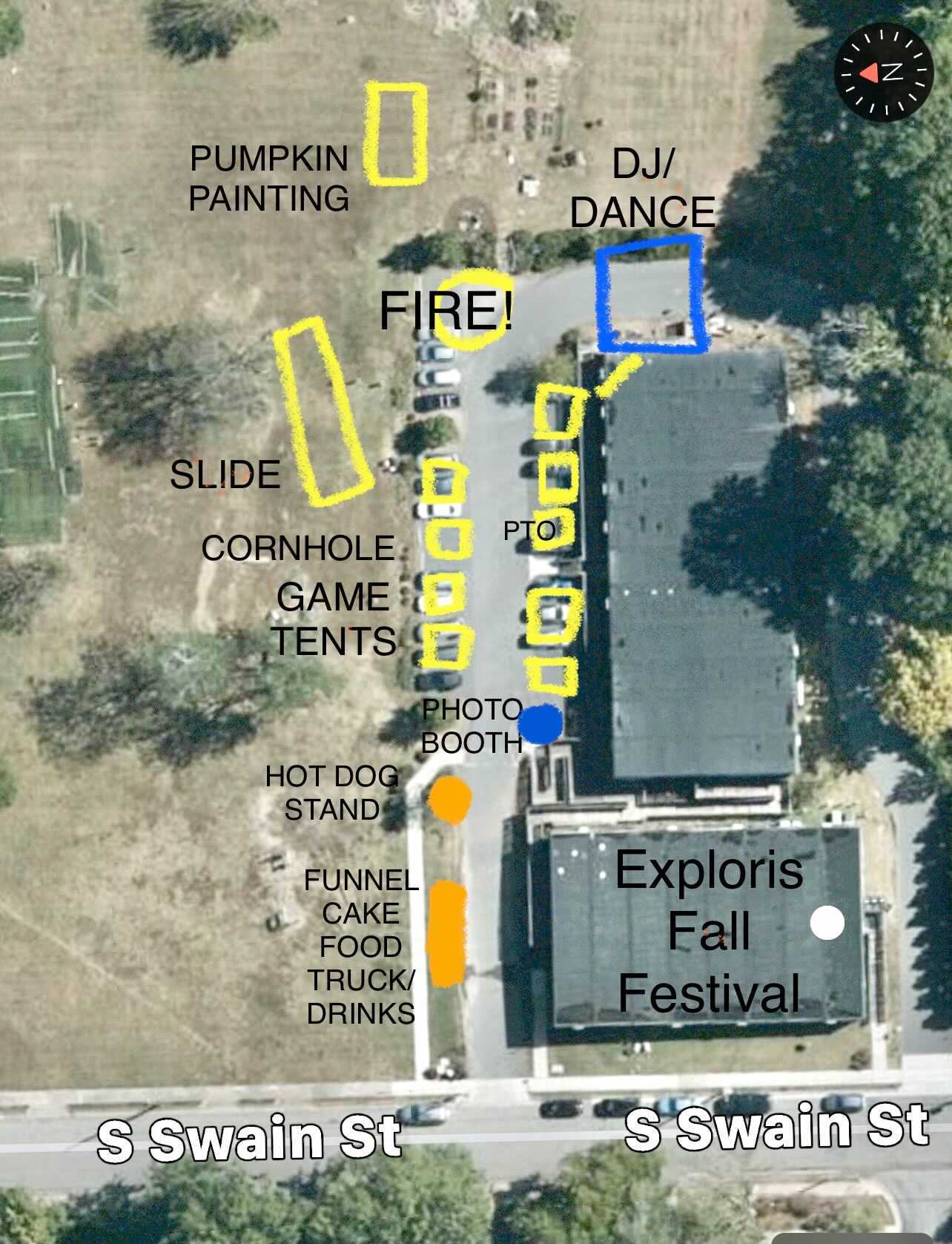 The festival takes place in the Exploris Elementary School parking lot and fields. See diagram below.