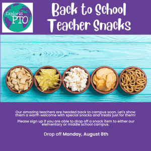 Our amazing teachers are headed back to campus soon. Let’s show them a warm welcome with special snacks and treats just for them! Please sign up if you are able to drop off a snack item to either our elementary or middle school campus.