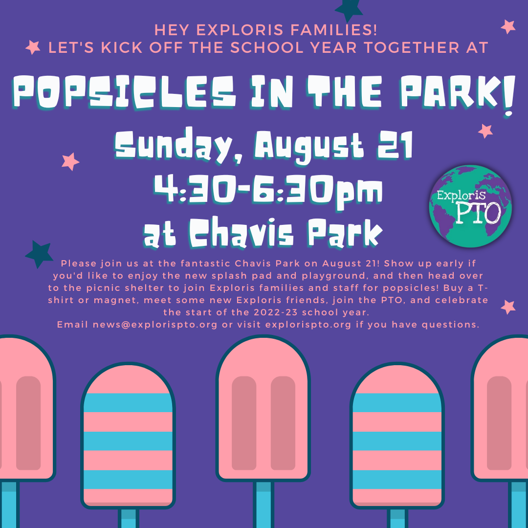 The first PTO social event of this year is Sunday, August 21 with Popsicles in the Park. This is open to both Elementary and Middle School families. This event is a great way to meet other Exploris families and staff and get to know more about our Exploris Community.