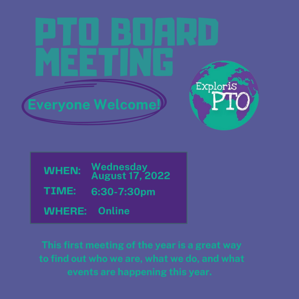 Meet the Teacher is TODAY Monday, August 15, drop in anytime between 4:00 and 6:00pm. There will be representatives from the PTO on both campuses. If you have any questions about how to get involved, we would love to talk to you! You can also attend our first PTO meeting of the year this Wednesday, August 17 at 6:30pm (check the Exploris Calendar for the link).