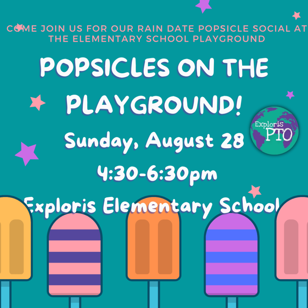 Sometimes, weather just doesn’t cooperate. But good news, the PTO is on it, and has rescheduled Popsicles in Park! We will now meet at the Exploris Elementary School Playground, Sunday, August 28.