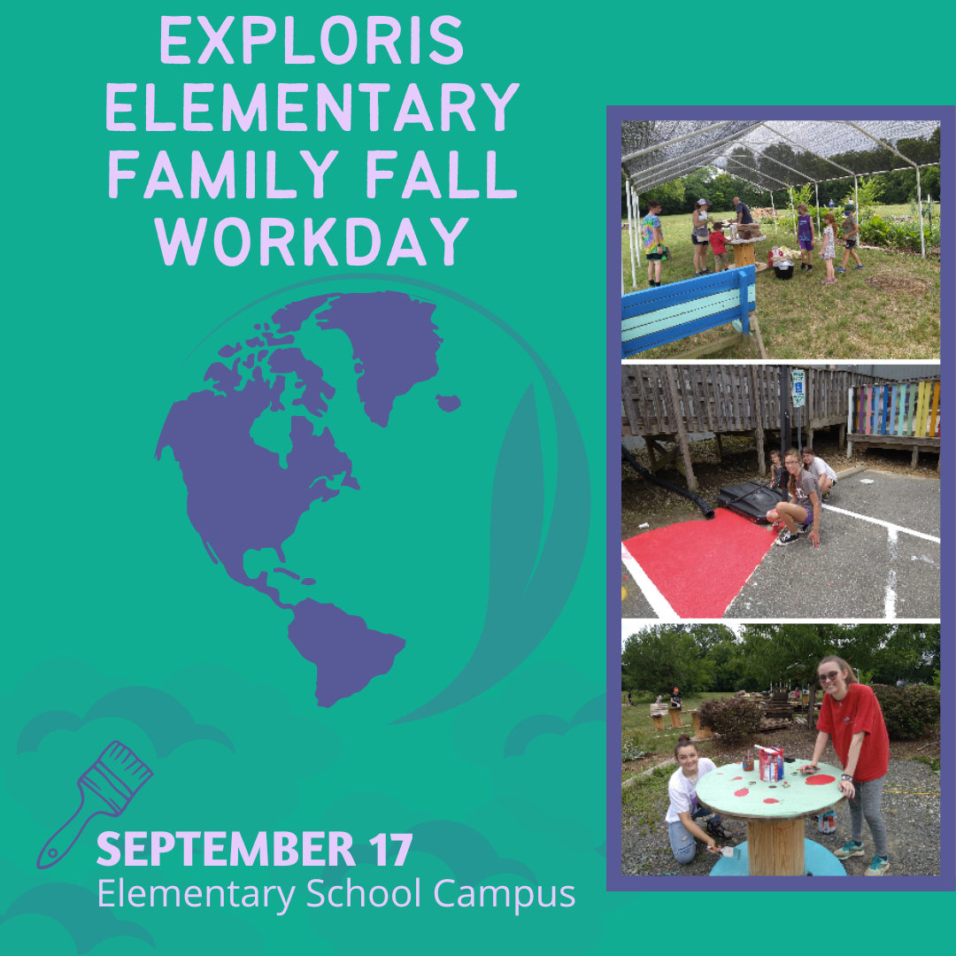 Next weekend (Saturday, September 17) is our first Family Fall Workday of the school year! It will take place on the Elementary Campus (Middle School Family Workday will come later- the WHOLE Exploris community is invited to both events).