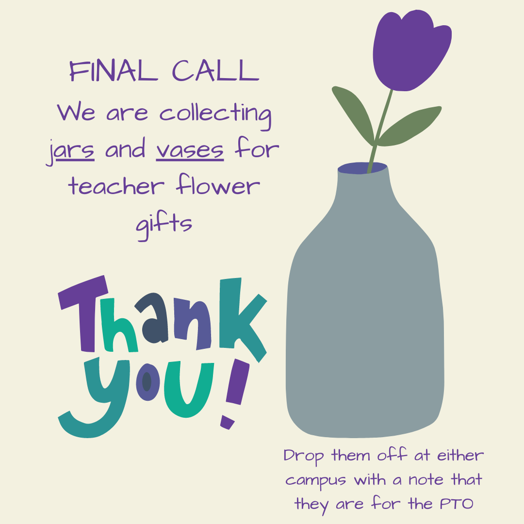 Last call for jars/ vases for teacher appreciation! Please drop them off at either campus before fall break. Thank you so much! Email PTOpres@exploris.org if you have any questions.