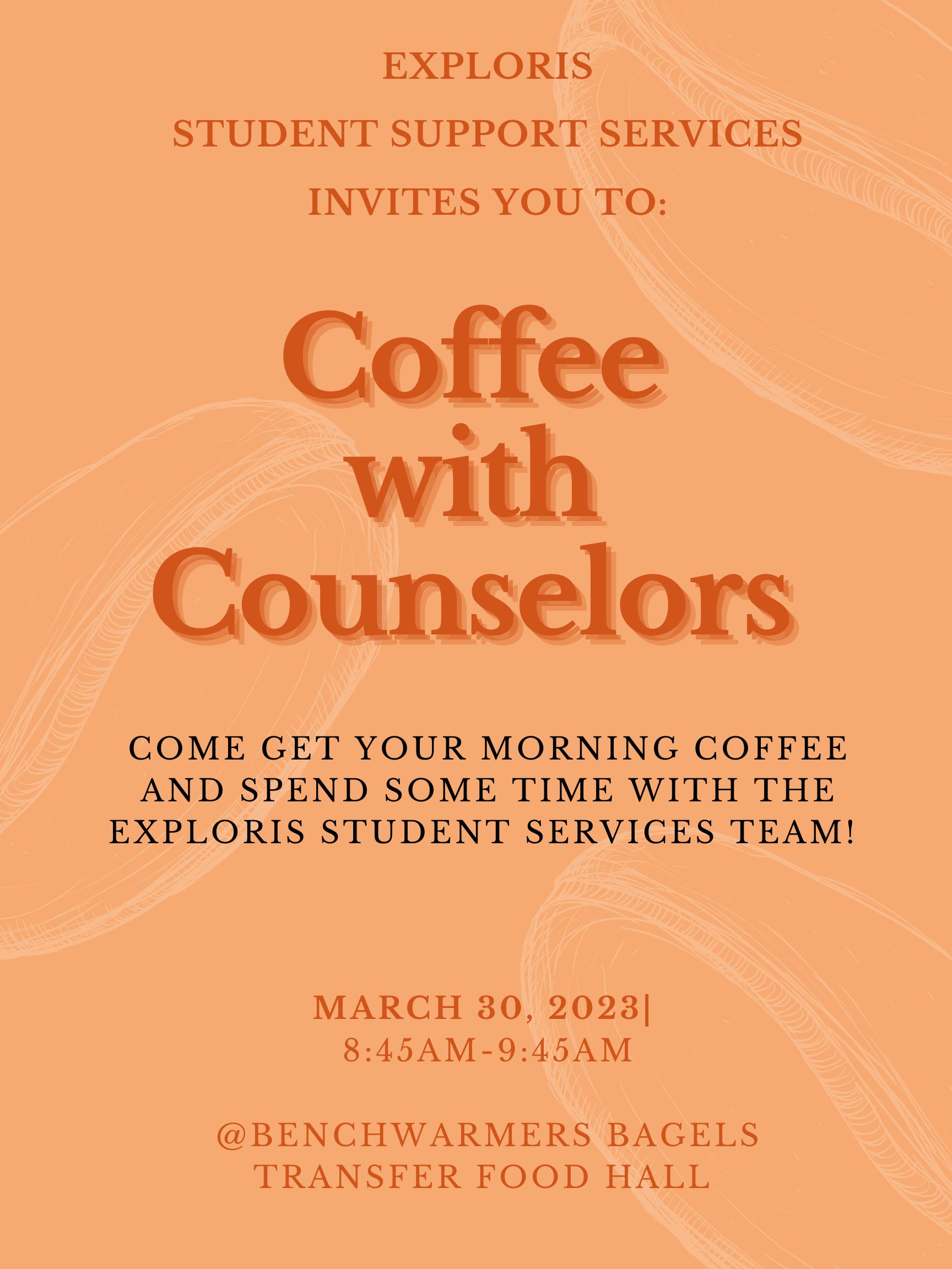 Want to learn more about what’s happening with your Student Services Team? Have questions you want to ask? Come have a coffee with our team this coming Thursday (3/30)!
