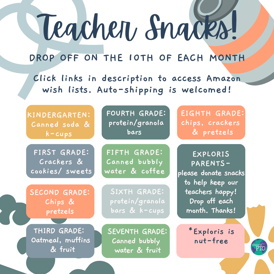 Our teachers thank you for all of the great snack donations so far! They are especially grateful for covering a wide variety of dietary requirements (plant-based, nut-free, etc.). Please consider donating snacks if you haven’t already. If you prefer to order online for shipping, you can access each school’s amazon wish list: