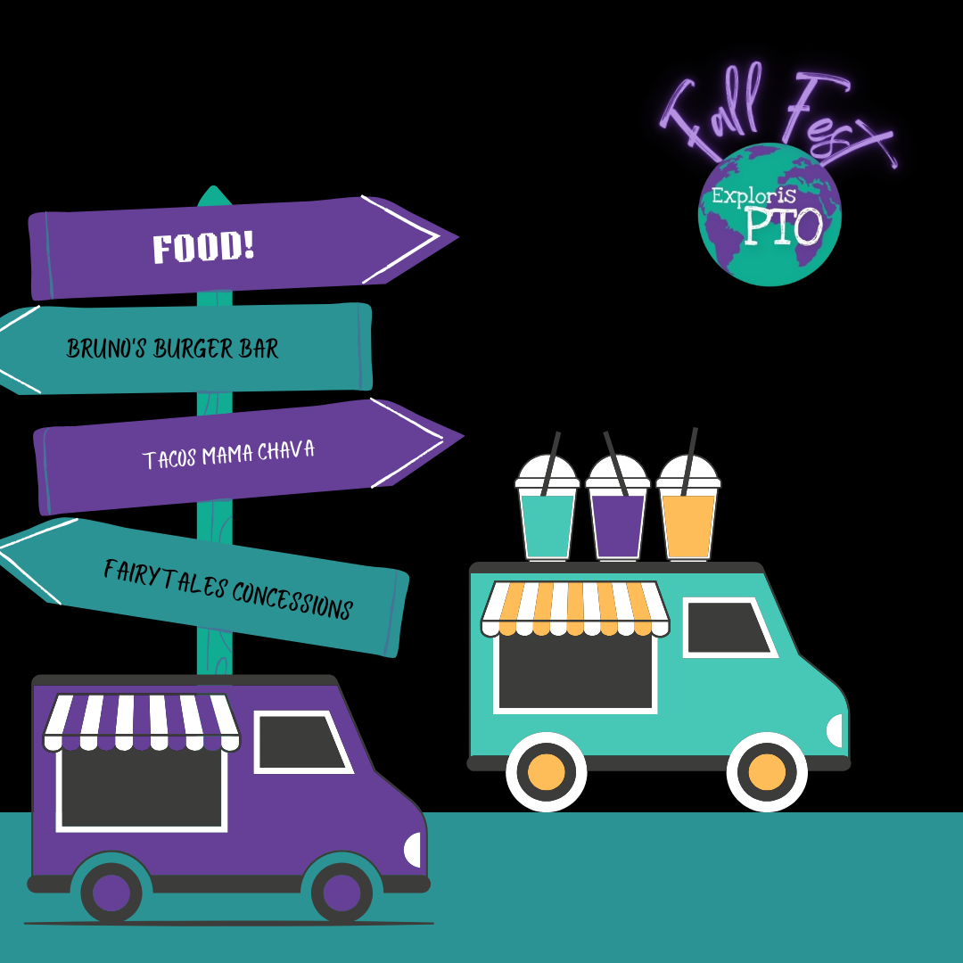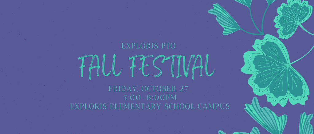 The Exploris PTO is excited to invite our entire school community to the 2023 Fall Festival! Put on a fun costume and plan to join us on outside on October 27 from 5-8pm at the Exploris Elementary School campus. Bring a carved pumpkin to enter in the contest! Bring a few dollars for the food trucks and stay for dinner around the fire. Make sure to wear your dancing shoes because DJ Machette will make this a party!